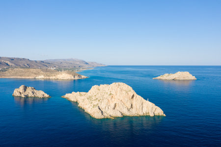 Aerial view of rugged rocky islets surrounded by calm, deep blue water off the coast of Crete, Greece. The scene features sunlit textures, open sea, and distant hills under a cloudless sky.