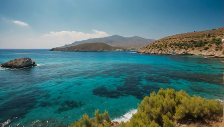 Expansive view of calm blue Mediterranean waters meeting a rugged, sunlit coastline with arid hills in Crete. The clear sky and gentle light create a spacious, peaceful atmosphere.