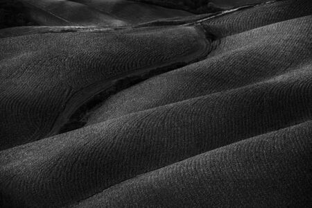 Country landscape along the road from Montepulciano to Asciano, Siena, Tuscany, Italy, at summer. Black and white