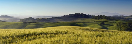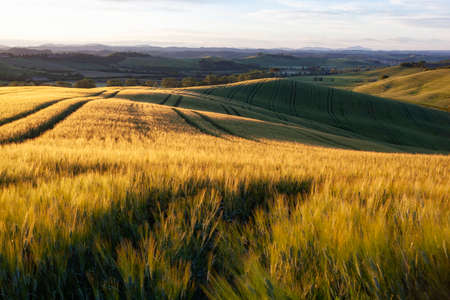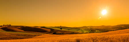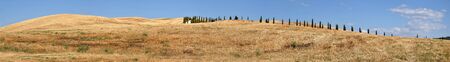 Summer Italian landscape with a wheat field of ripe, and hills and dales in the background. Panorama view of Tuscany in Italy