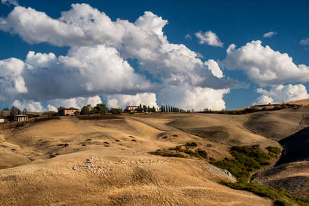 Asciano (SI), Italy - August 02, 2021: Typical scenary of Crete Senesi, Asciano, Siena, Tuscany, Italy