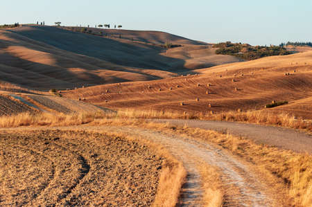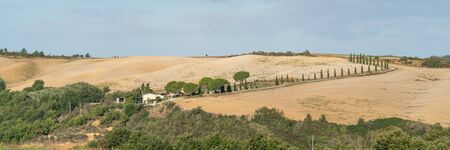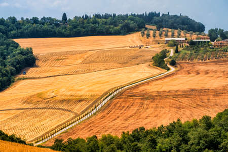 Country landscape along the road from Asciano to Torre a Castello, Siena, Tuscany, Italy, at summer