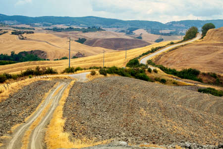 Country landscape along the road from Asciano to Siena, Tuscany, Italy, at summer