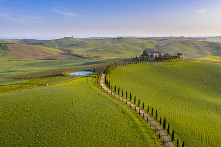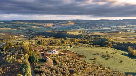 Aerial view of a rural landscape during sunset in Tuscany. Rural farm, cypress trees, green fields, sunlight and clouds. Italy, Europe.