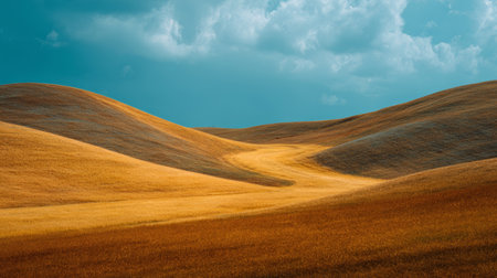 Golden rolling hills under bright blue sky with scattered clouds create peaceful and warm natural landscape scene