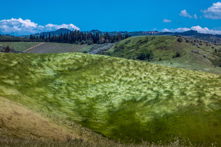 Wavy fields in Tuscany with shadows and farms, Italy. Natural outdoor seasonal spring background with blue sky and clouds.