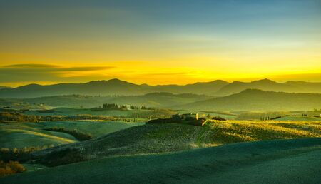 Tuscany, rural landscape at sunset. Rural farm, cypresses, green field, sunshine and clouds. Italy, Europe.