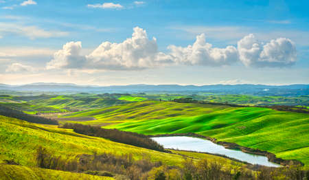 Tuscany landscape, small lake, green and yellow fields in Crete Senesi. Italy, Europe.