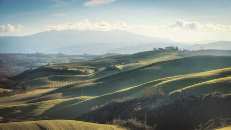 Landscape in Tuscany with farmhouse and rolling hills on a winter afternoon. A typical view of the Val d'Orcia. Mount Amiata in the background, Italy