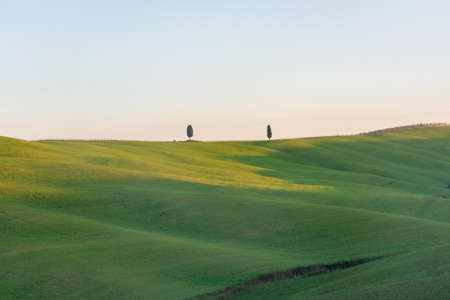 Two cypresses over a hill in the Tuscany countryside at dawn, Italy