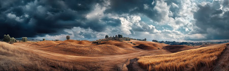 An expansive view of undulating golden hills with patches of grass under a dynamic sky filled with dark clouds. The rural setting exudes tranquility at sunset.