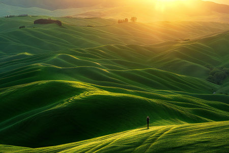 Lonely man walking on the green field in Tuscany, Italy
