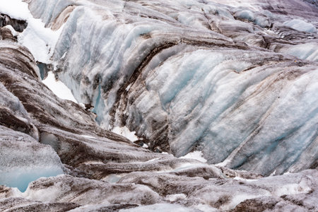 Glacier crevasses in Norway, Jostedalsbreen. Close up showing abstract pattern of blue ice, dirt and melting water caused by climate change