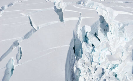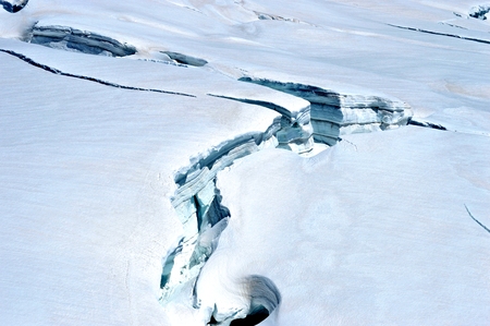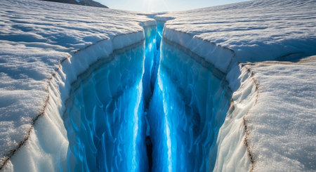Crack in the ice of a glacier due to global warming and climate change. Melting snow causing sinkhole.