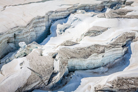 Crevices mark surface of glacier. Landscape is illuminated by daylight, highlighting texture and color of ice. Gornergletscher, Zermatt, Valais, Alps, Switzerland.