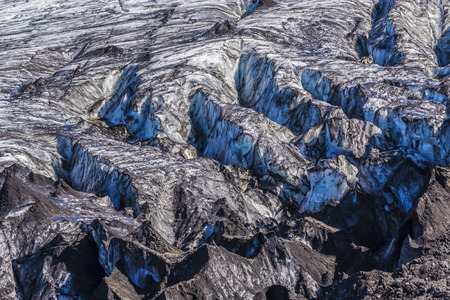 Icelandic glacier close up with ash streaked ridges and crevasses
