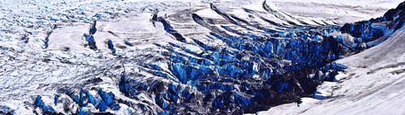 Panoramic view at the glassier fracture, Cracked glacier surface with deposits of black volcanic cinder, Kverkfjoll massif in Icelandic Vatnajokull National Park in Icelandic Vatnajokull National Park