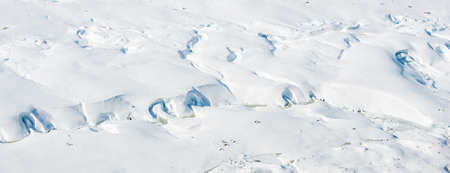 Fresh snow texture. Panoramic view of snow-covered field after a blizzard at sunset. Winter wonderland. Ice desert. Ecology, weather, climate change, global warming