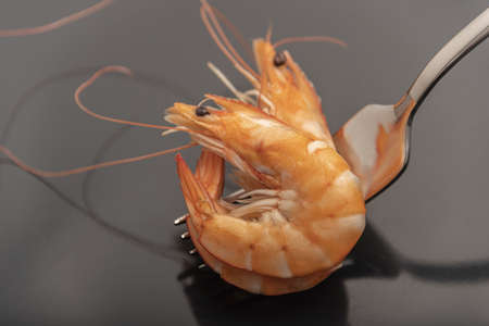 Red Argentine shrimp on a fork. One piece, side view, black background.