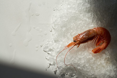 Shrimps lying in a row isolated on a dark background with copy space for text. Seafood buffet in restaurant concept. Use seafood buffet for promotions. emotional burnout, suspended animation metaphor