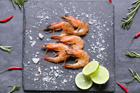 Fine selection of jumbo shrimps for dinner on stone plate.