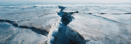 Aerial view of a deep crack splitting a frozen blue ice surface. Climate change, melting glacier, environmental impact.