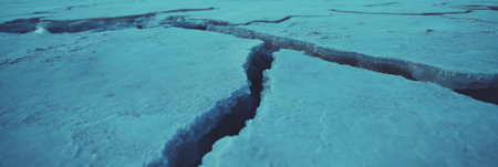 Cracks in the thick ice cover of a frozen lake reveal deep blue water beneath, highlighting natural processes in a cold winter landscape.