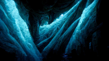 Mysterious underground river flowing through dark cave illuminated by faint light