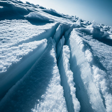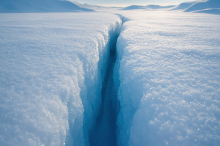 Deep fissure across frozen arctic ice sheet under bright daylight, revealing striking blue hues in remote polar environment.