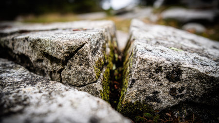 Low-angle, photograph captures the detail of a weathered, light-colored granite stone that has split vertically, creating a narrow fissure running between the two pieces. Small patches of green moss and dark lichen cling to the rough, uneven surfaces, emphasizing the natural decomposition and age of the rock in an outdoor, wilderness setting with a shallow depth of field blurring the distant background.