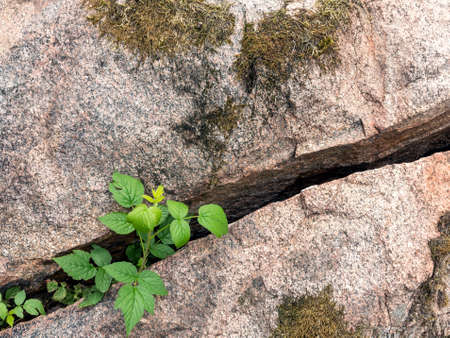 Young plant grows through the gap of a large stone