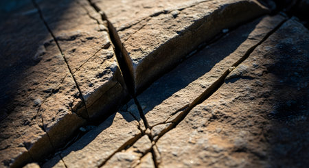A detailed, textured view of ancient stone showing prominent cracks and dramatic shadows cast by sunlight.