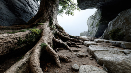 A breathtaking view of a majestic tree with large roots at the entrance of a cave, set against a misty and serene landscape. Ideal for nature enthusiasts.