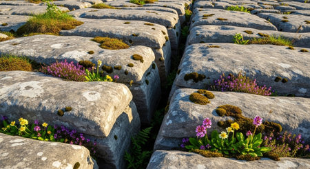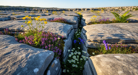 Wildflowers growing between the limestone rocks in the Burren in West Ireland