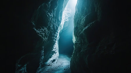 Narrow passage inside a dark cave, illuminated by soft light, with space for copy.