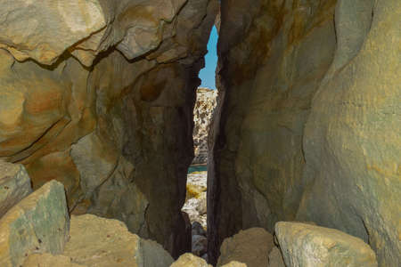 A beautiful shot of a crack in a rocky cave at the sea