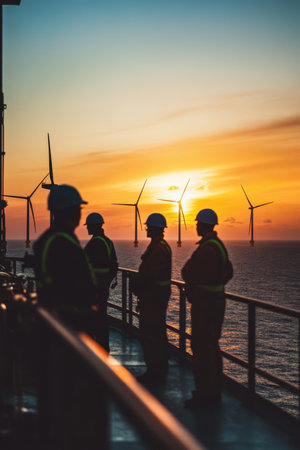 The workers on the ships deck admire majestic wind turbines against a stunning sunset, showcasing the harmony between advanced technology and the soothing nature of the vast ocean