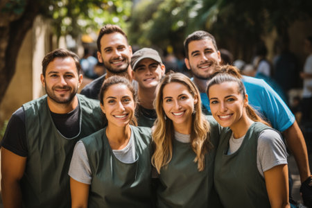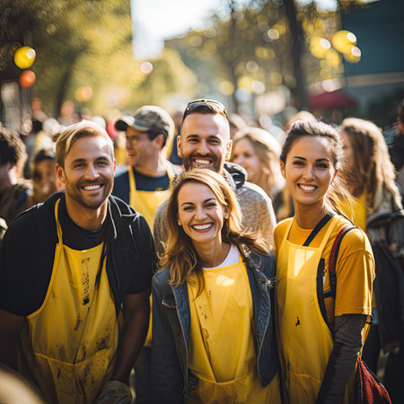Young Volunteers with garbage bags cleaning park area. Ecology, Charitable organization concept. Generative AI