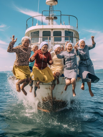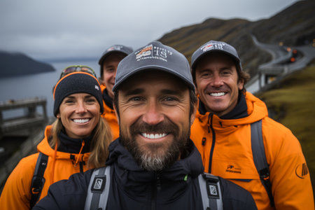 selfie of a group of people with a catch after a successful fishing trip. In the photo, people are smiling and emotions and an atmosphere of satisfaction are conveyed, Generative AI