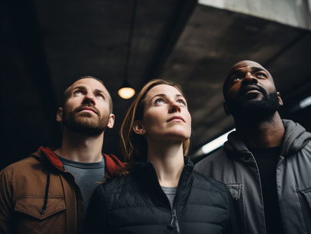 selective focus of multicultural friends looking up while standing in subway station
