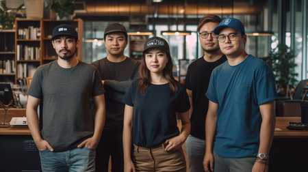 Group of asian young men and women in casual wear standing in the office.