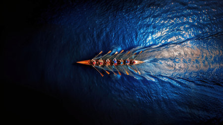 Rowers in sleek boat glide through shimmering blue water, creating ripples in their wake. teamwork and synchronization of crew are evident as they navigate serene environment