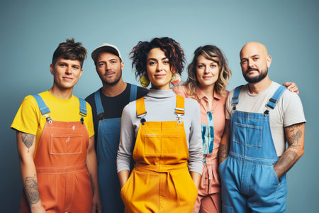 Attractive man and women in colorful work clothes. world labor day