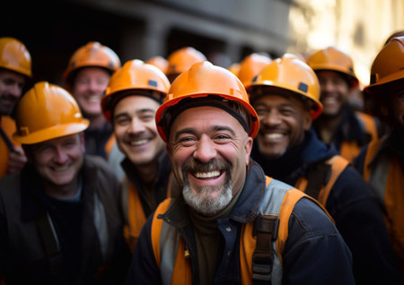 A diverse group of construction workers is smiling and collaborating effectively, showing teamwork in their tasks