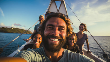 selfie of group of diverse young happy friends on a boat at sea similing
