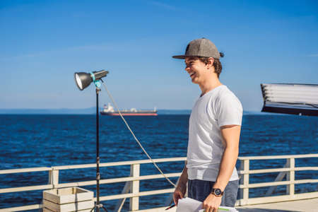 Portrait of a young successful man on the background sea landsca