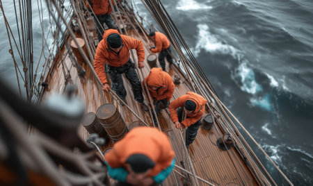 Group of young sailors or cadets wearing orange safety suits and helmets, listening during a maritime training exercise on a boat