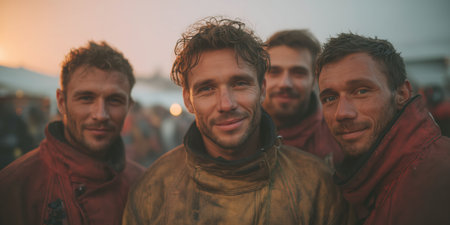 Group of happy young men standing together in the city, looking at camera