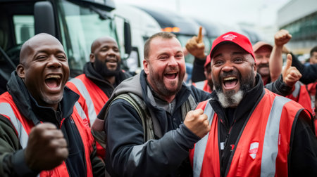 Group of workers on a construction site rejoicing with arms raised.