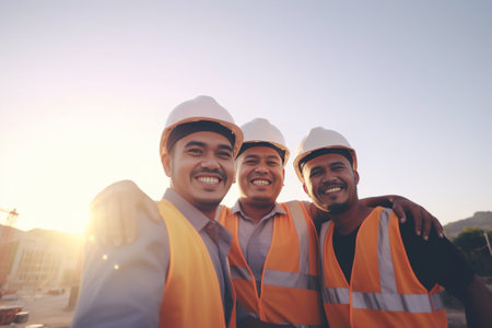 Diverse group of happy construction worker with helmets standing on construction site.AI Generative.